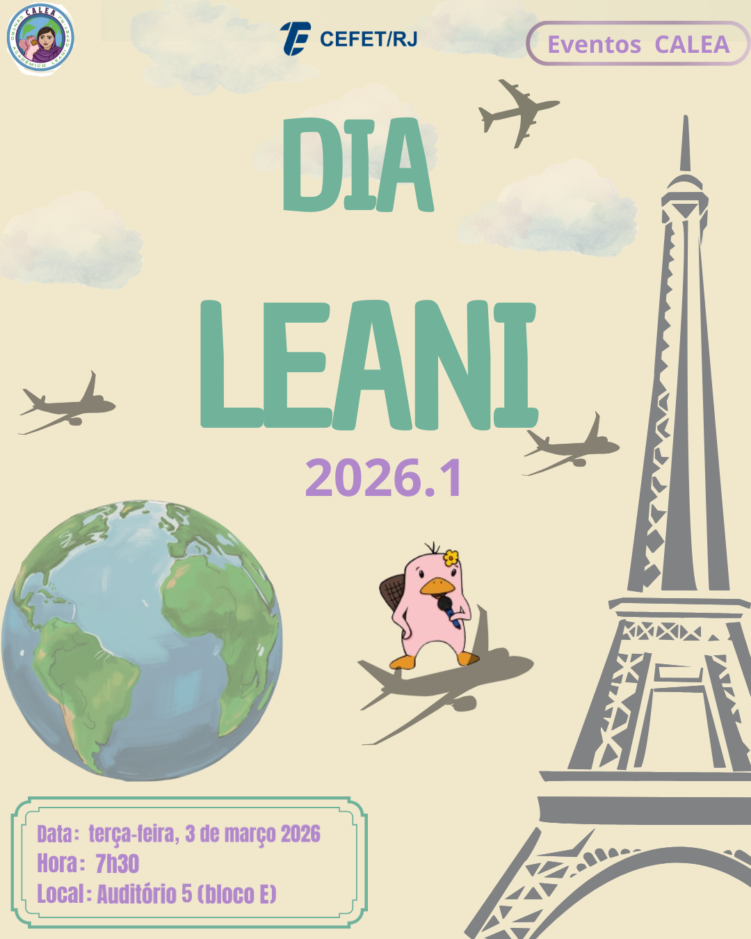 A Coordenação de Línguas Estrangeiras Aplicadas às Negociações Internacionais (LEANI) e o Centro Acadêmico do curso (CALEA) convidam a comunidade acadêmica para o Dia LEANI 2026, encontro de recepção e boas-vindas aos novos alunos do bacharelado em LEANI.