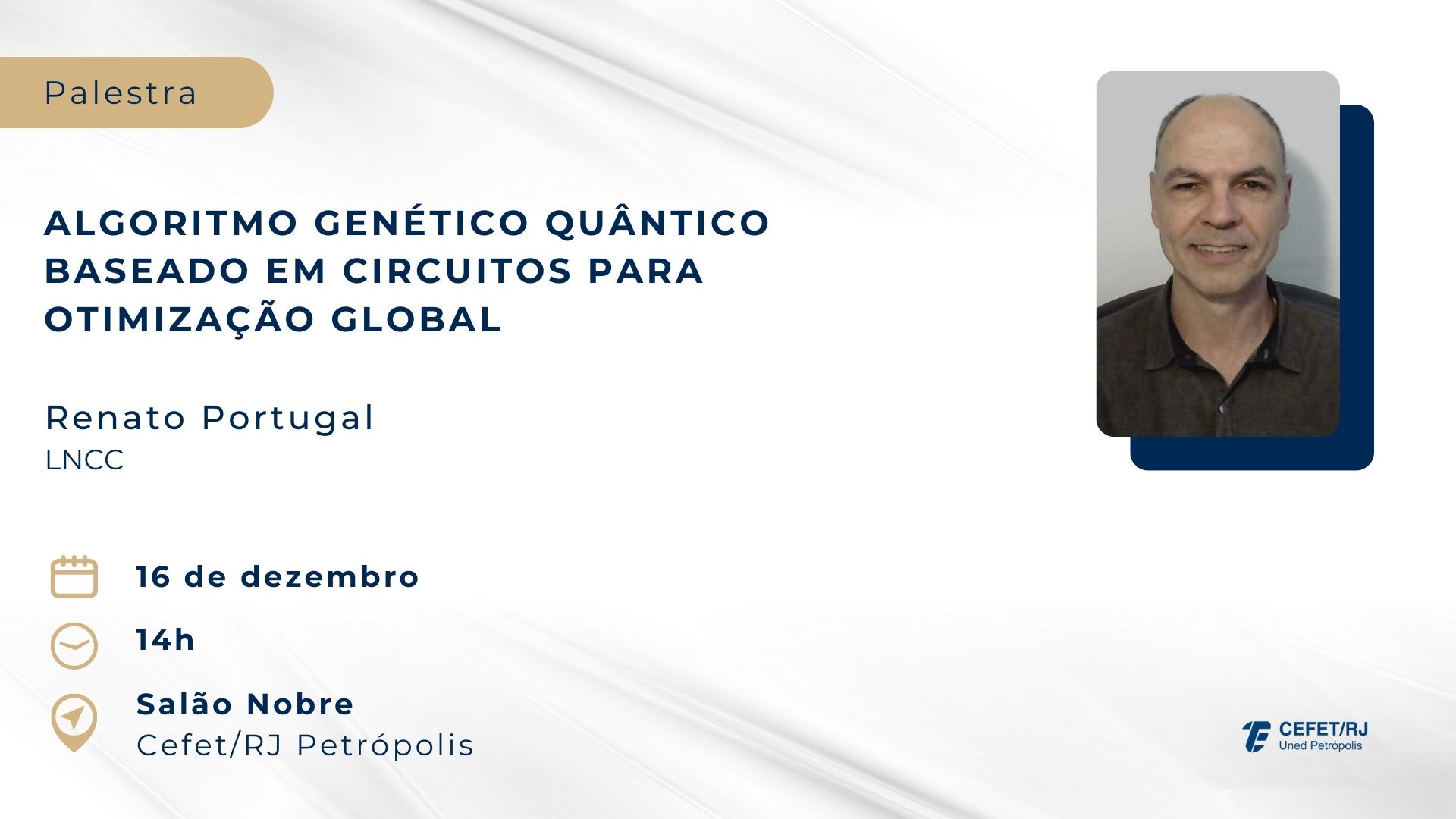 O pesquisador do Laboratório Nacional de Computação Científica (LNCC) Renato Portugal ministra na próxima terça-feira, dia 16 de dezembro, a palestra “Algoritmo genético quântico baseado em circuitos para otimização global”. O evento – que será realizado no Salão Nobre do Cefet/RJ Petrópolis, às 14h – é gratuito e aberto ao público em geral.
