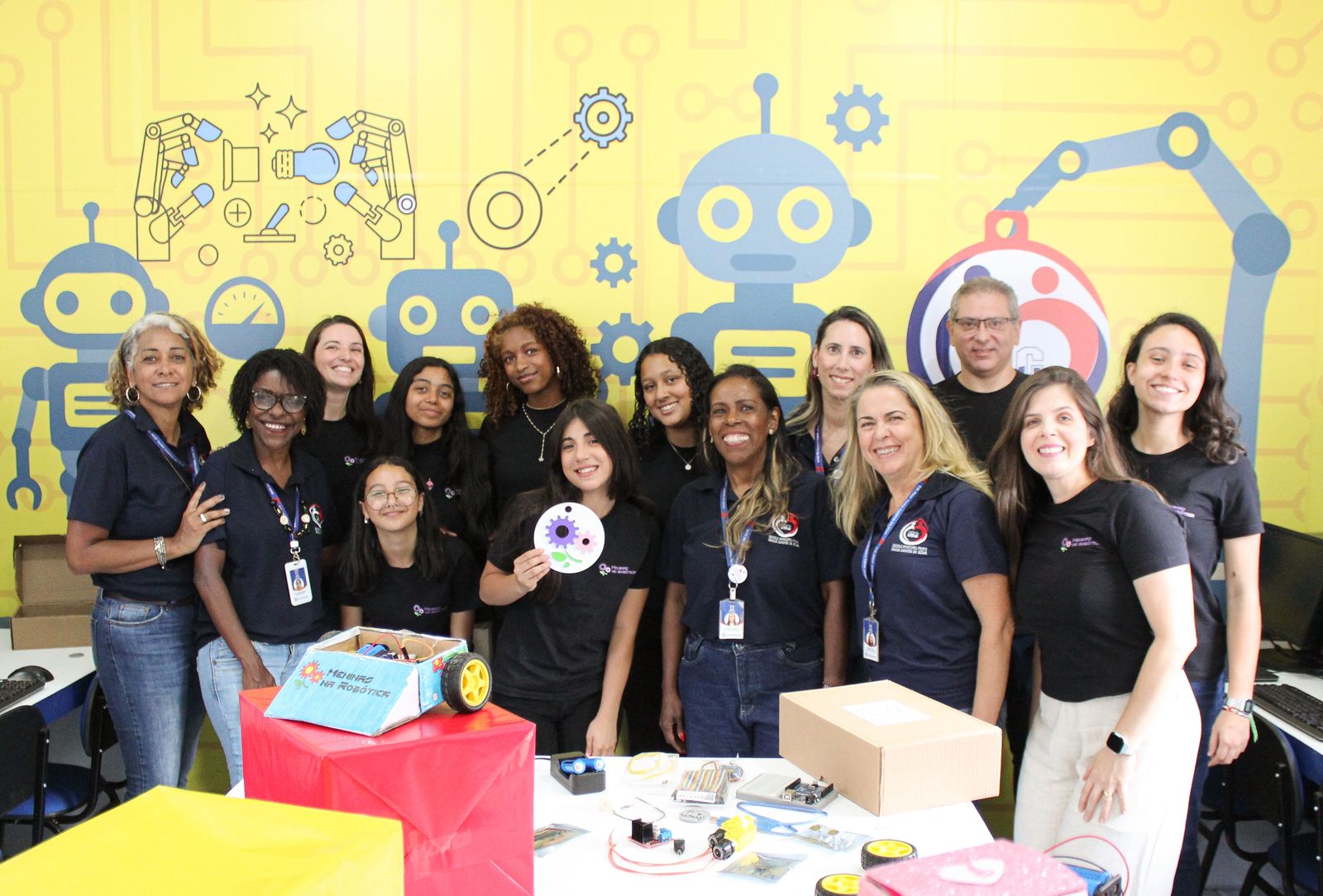 Coordenadoras, professoras e bolsistas do Meninas na Robótica na inauguração da sala na Escola Maria Campos