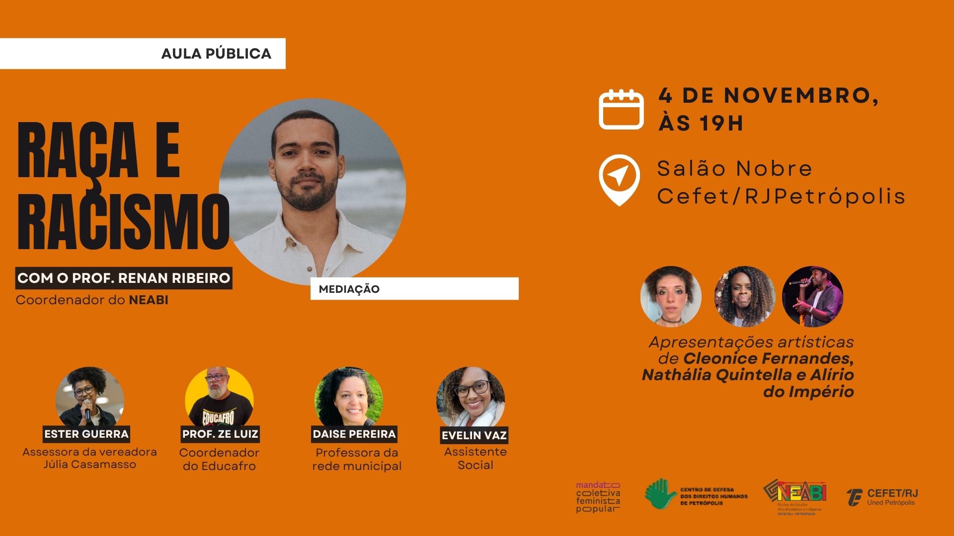 O Núcleo de Estudos Afro-brasileiros e Indígenas (Neabi) do Cefet/RJ Petrópolis promove na próxima terça-feira, dia 4 de novembro, às 19h, a aula aberta pública “Raça e Racismo”. O encontro, que acontecerá no Salão Nobre da unidade, será conduzido pelo professor e coordenador do Neabi Petrópolis, Renan Ribeiro.