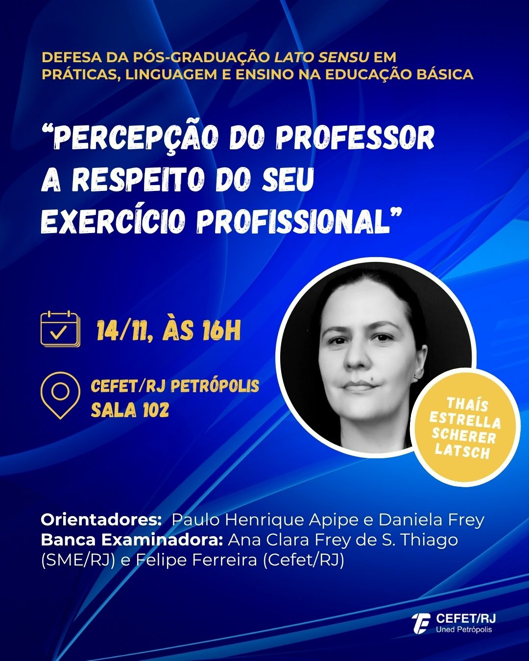 No próximo dia 14 de novembro, o Programa de Pós-Graduação lato sensu em Práticas, Linguagem e Ensino na Educação Básica, do Cefet/RJ Petrópolis, inicia as defesas de conclusão de...