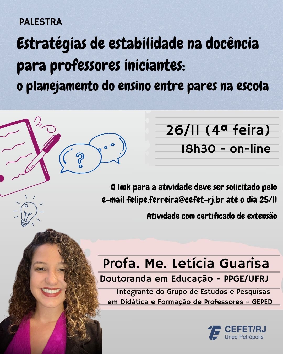 No dia 26 de novembro (quarta-feira), às 18h30, o Cefet/RJ Petrópolis promove a palestra on-line “Estratégias de estabilidade na docência para professores iniciantes: o planejamento...