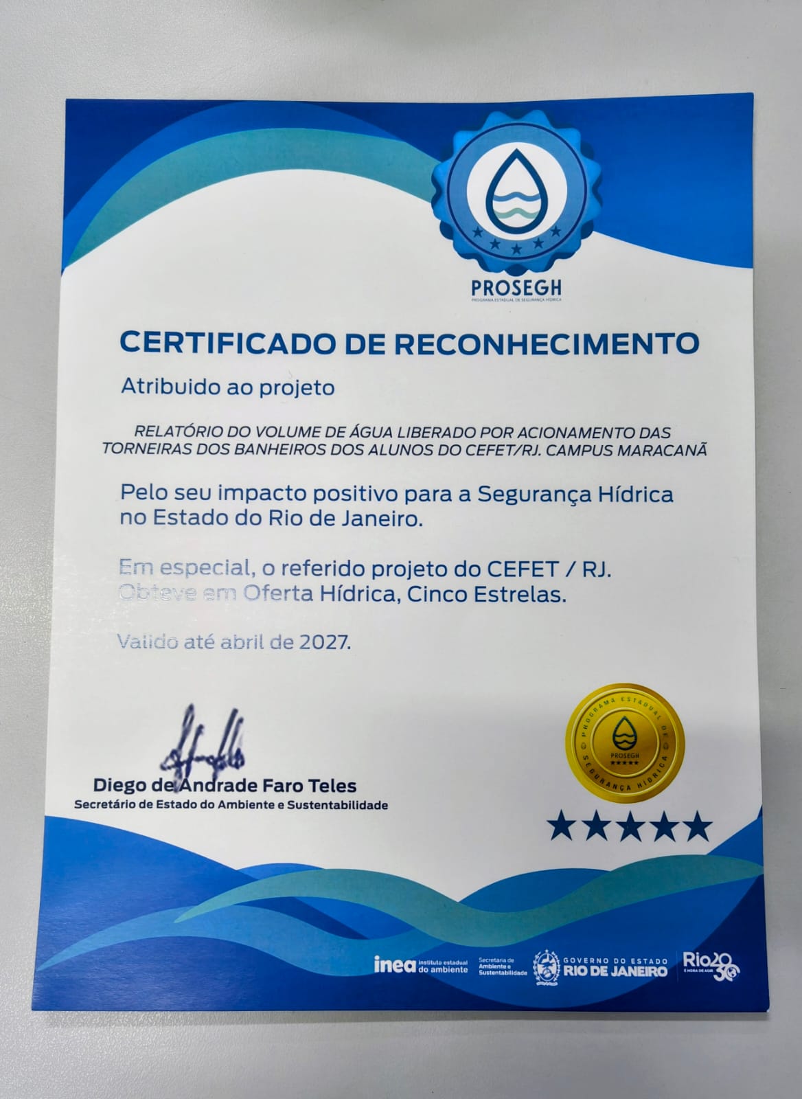 O Cefet/RJ conquistou o Selo do Programa Estadual de Segurança Hídrica (Prosegh), concedido pelo Instituto Estadual do Ambiente (Inea) e pela Secretaria de Estado do Ambiente e Sustentabilidade (Seas). A Unidade Maracanã obteve cinco estrelas, avaliação máxima, em oferta hídrica pelo projeto “Relatório do volume de água liberado por acionamentos nas torneiras dos banheiros dos alunos do Cefet/RJ campus Maracanã”.