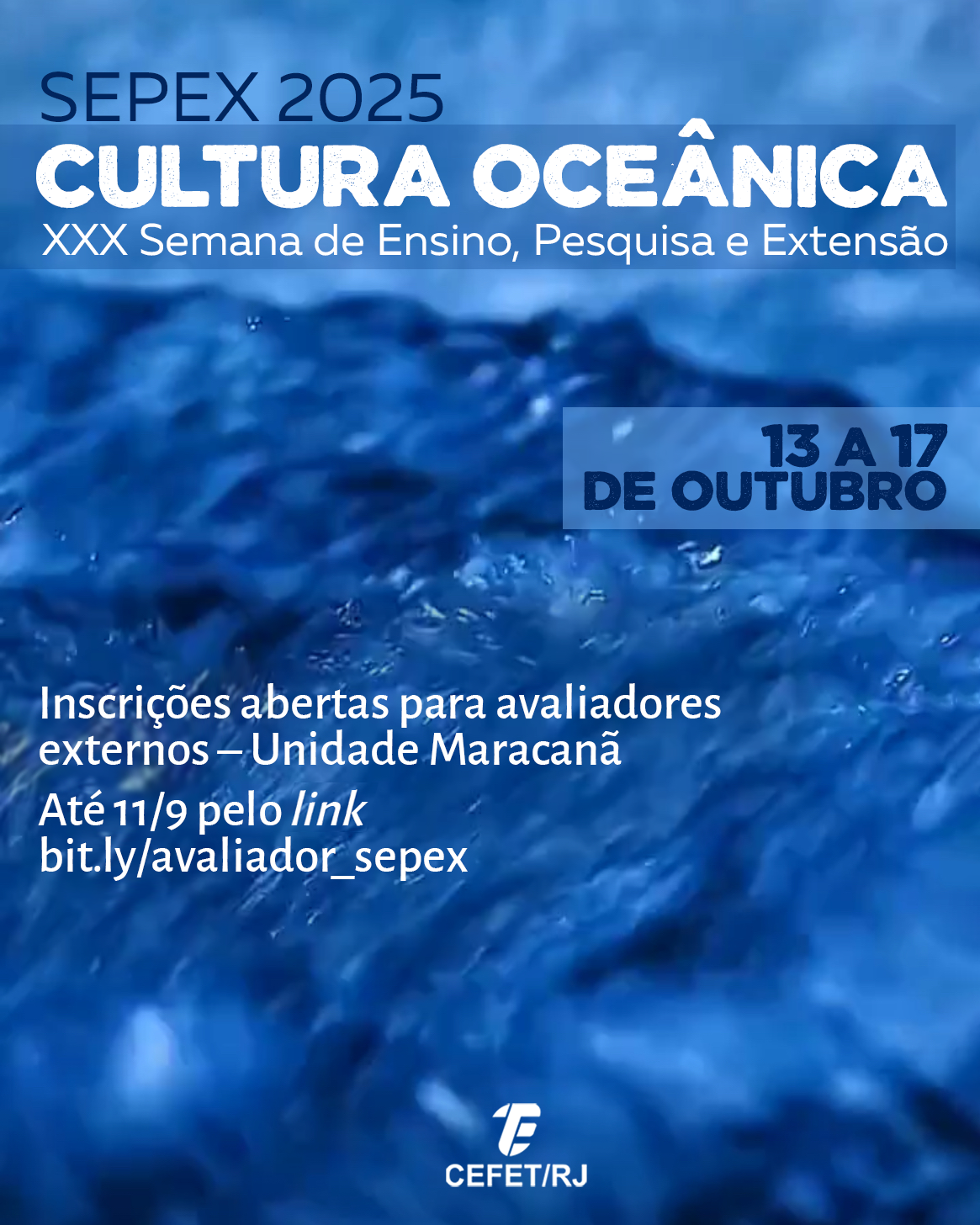 A Diretoria de Extensão (DIREX) do Cefet/RJ, por meio do Departamento de Assuntos Comunitários (DEAC), informa que estão abertas as inscrições para avaliadores externos dos projetos da Semana de Ensino, Pesquisa e Extensão (Sepex) na Unidade Maracanã. Com o tema “Cultura Oceânica”, o evento vai ocorrer de 13 a 17 de outubro de 2025. Os interessados têm até o dia 11 de setembro para preencher o formulário disponível no link bit.ly/avaliador_sepex.