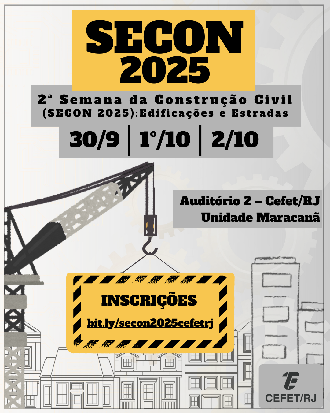 A coordenação dos cursos técnicos em Construção Civil vai realizar a 2ª Semana da Construção Civil (SECON 2025): Edificações e Estradas, entre os dias 30/9 e 2/10, no Auditório 2 do Cefet/RJ Unidade Maracanã. O evento é direcionado a estudantes, professores e profissionais da instituição e também é aberto ao público em geral.