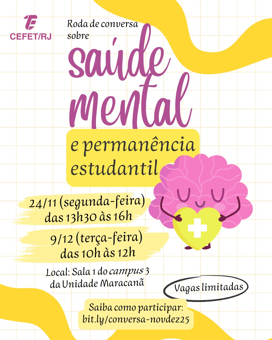 Nos dias 24 de novembro e 9 de dezembro, a Unidade Maracanã vai promover a “Roda de conversa sobre saúde mental e permanência estudantil”, voltada aos alunos da instituição. As atividades serão realizadas na sala 1 do campus 3. Para garantir um espaço de diálogo mais próximo entre os participantes, as vagas são limitadas. Os interessados devem preencher o formulário de pesquisa e, ao final, indicar a data e o horário de preferência. Clique aqui para acessar o formulário.