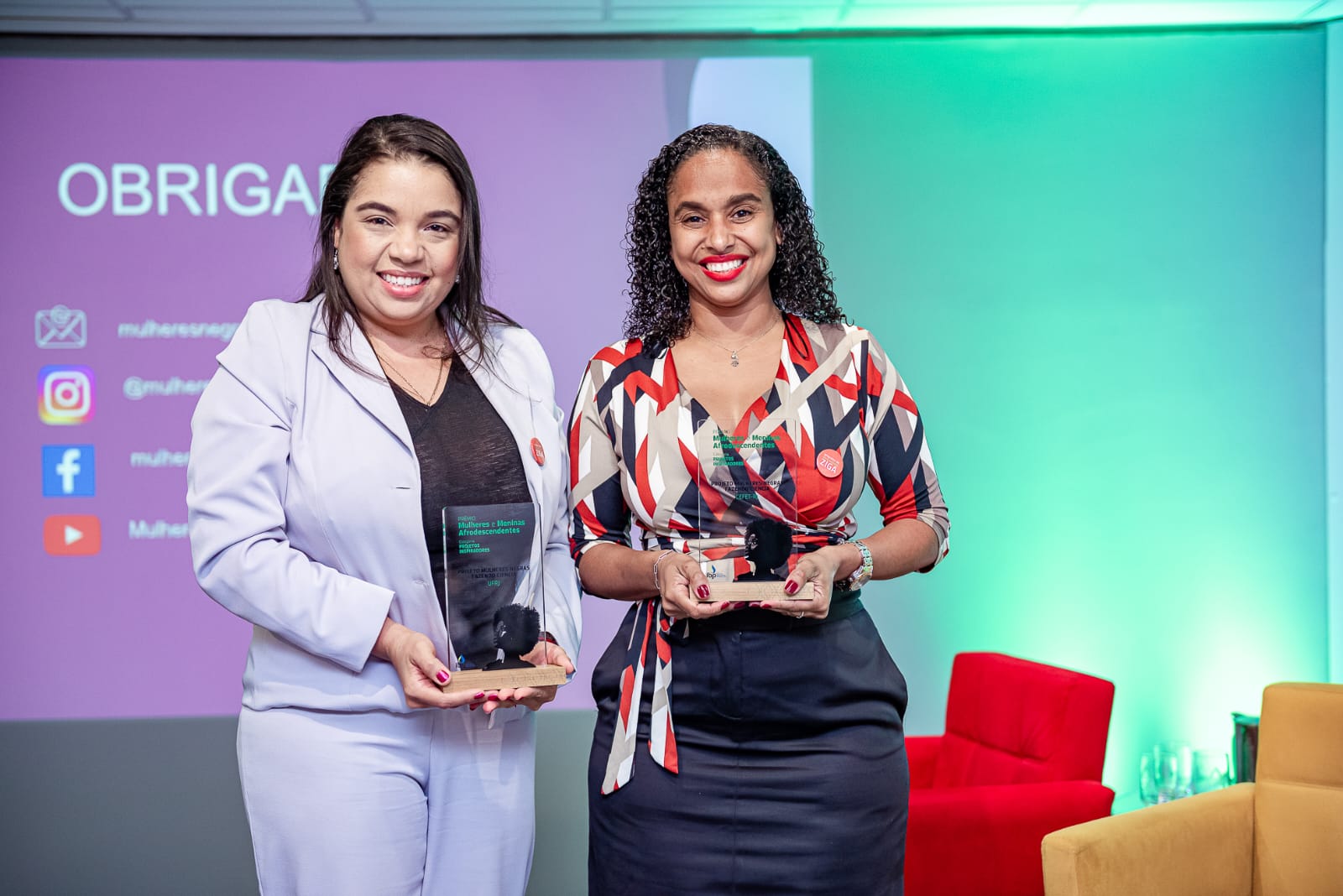 As professoras Michelle Mothé (UFRJ) e Luciana Espíndola (Cefet/RJ) com os troféus do Prêmio IBP Mulheres Afrodescendentes na Ciência