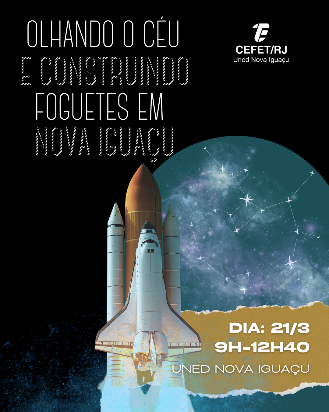 No próximo sábado, dia 21 de março, das 9h às 12h40, a Uned Nova Iguaçu vai promover a atividade de extensão “Olhando o céu e construindo foguetes em Nova Iguaçu”, realizada por integrantes da Olimpíada Brasileira de Astronomia (OBA). Ao todo, serão oferecidas 175 vagas à comunidade escolar do Cefet/RJ e ao público em geral. Crianças a partir de 10 anos também podem participar. Clique aqui para se inscrever.