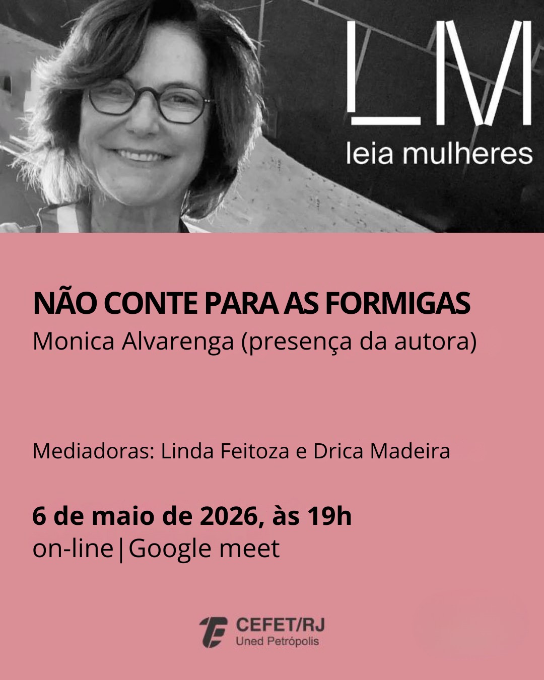 Em 6 de maio, o clube de leitura Leia Mulheres Petrópolis vai receber a escritora carioca Monica Alvarenga para debater o seu livro Não conte para as formigas. O evento on-line acontece às 19h, pelo Google Meet, e tem mediação de Linda Feitoza e Drica Madeira.