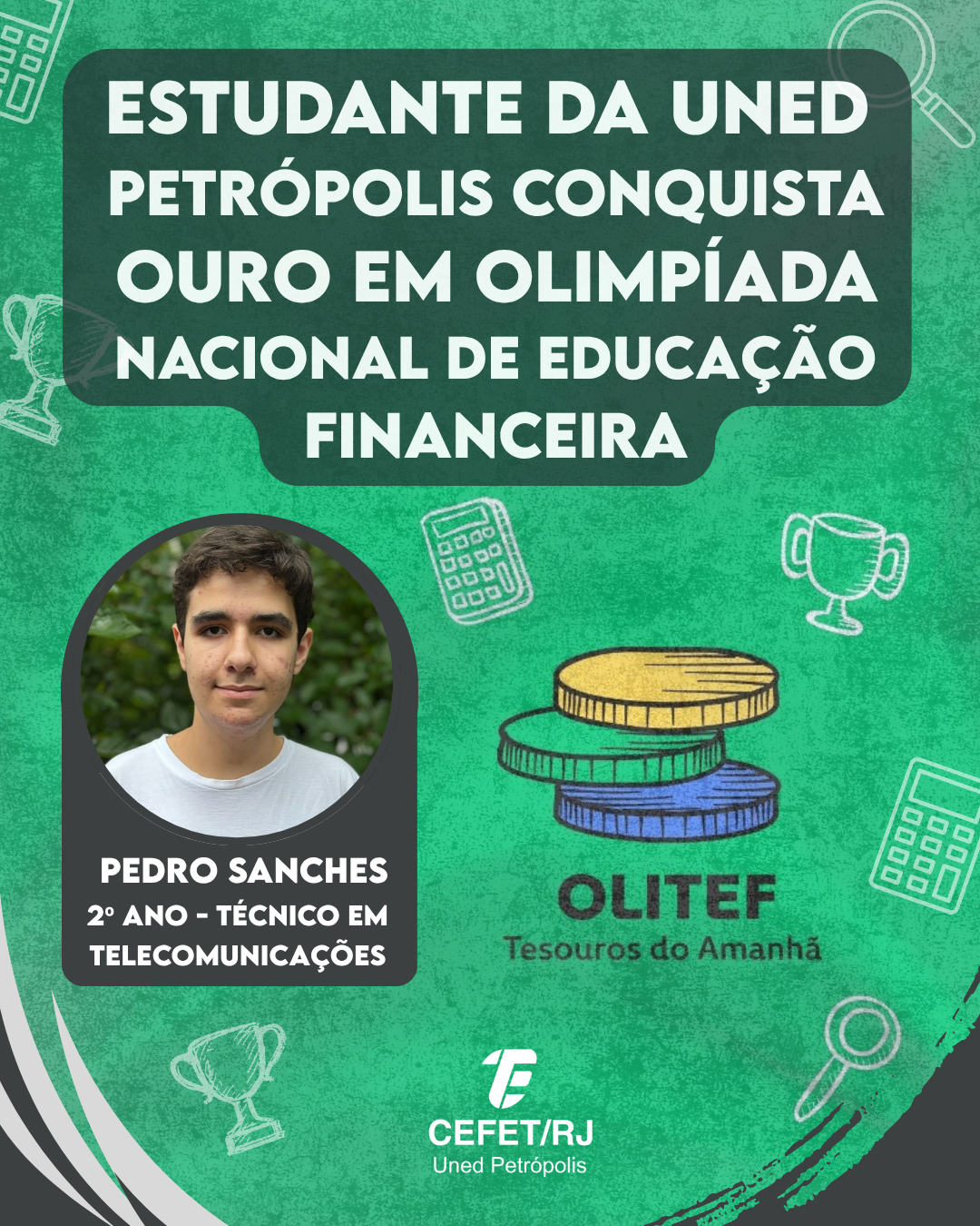 O aluno Pedro Sanches, do 2º ano do ensino médio integrado ao técnico em Telecomunicações do Cefet/RJ Uned Petrópolis, conquistou a medalha de ouro na Olimpíada do Tesouro Direto de Educação Financeira (OLITEF). A competição, de âmbito nacional, busca promover o conhecimento financeiro entre alunos do 6º ano do ensino fundamental até o 3º ano do ensino médio.