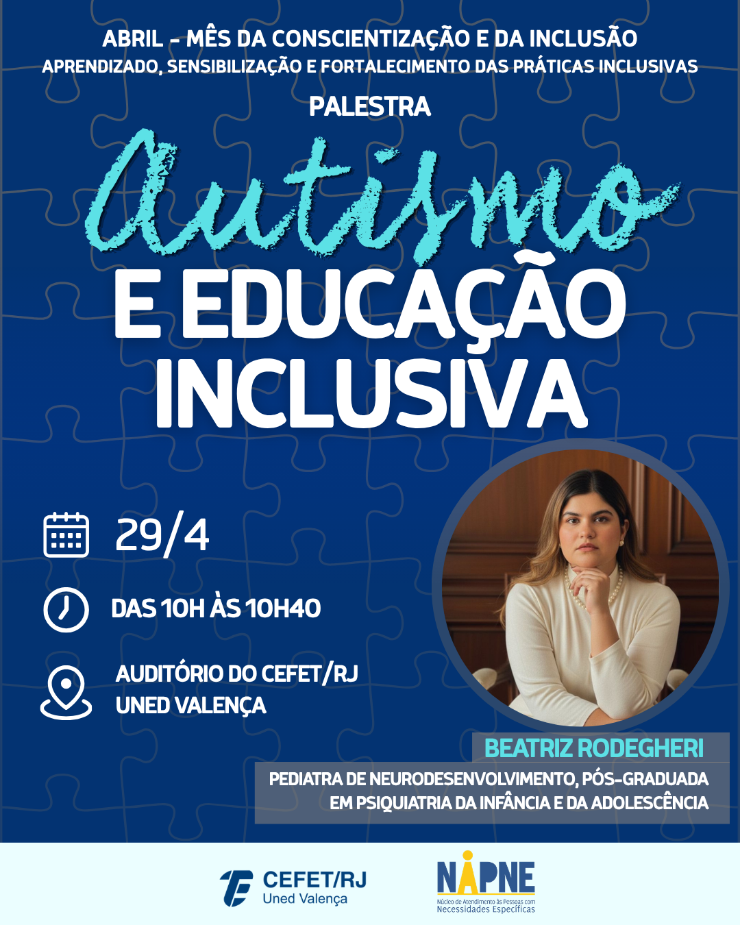 No dia 29 de abril, o Núcleo de Apoio às Pessoas com Necessidades Educacionais Específicas (NAPNE) do Cefet/RJ Uned Valença vai realizar a palestra “Autismo e educação inclusiva”, com Beatriz Rodegheri, pediatra de neurodesenvolvimento e pós-graduada em Psiquiatria da Infância e da Adolescência. O evento acontece das 10h às 10h40, no auditório da unidade,  e é voltado para as comunidades interna e externa, como forma de fortalecer a cultura de inclusão.