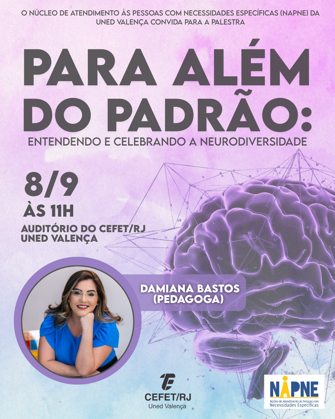 O Núcleo de Atendimento às Pessoas com Necessidades Específicas (NAPNE) da Uned Valença convida toda a comunidade para prestigiar a palestra “Para além do padrão: entendendo e celebrando a neurodiversidade”, que será ministrada pela pedagoga Damiana Bastos. A convidada é especialista em psicomotricidade, tecnologias aplicadas à educação, neuropsicopedagogia clínica e institucional, gestão de políticas educacionais e psicopedagogia. A atividade será realizada no dia 8 de setembro, às 11h, no Auditório da unidade.