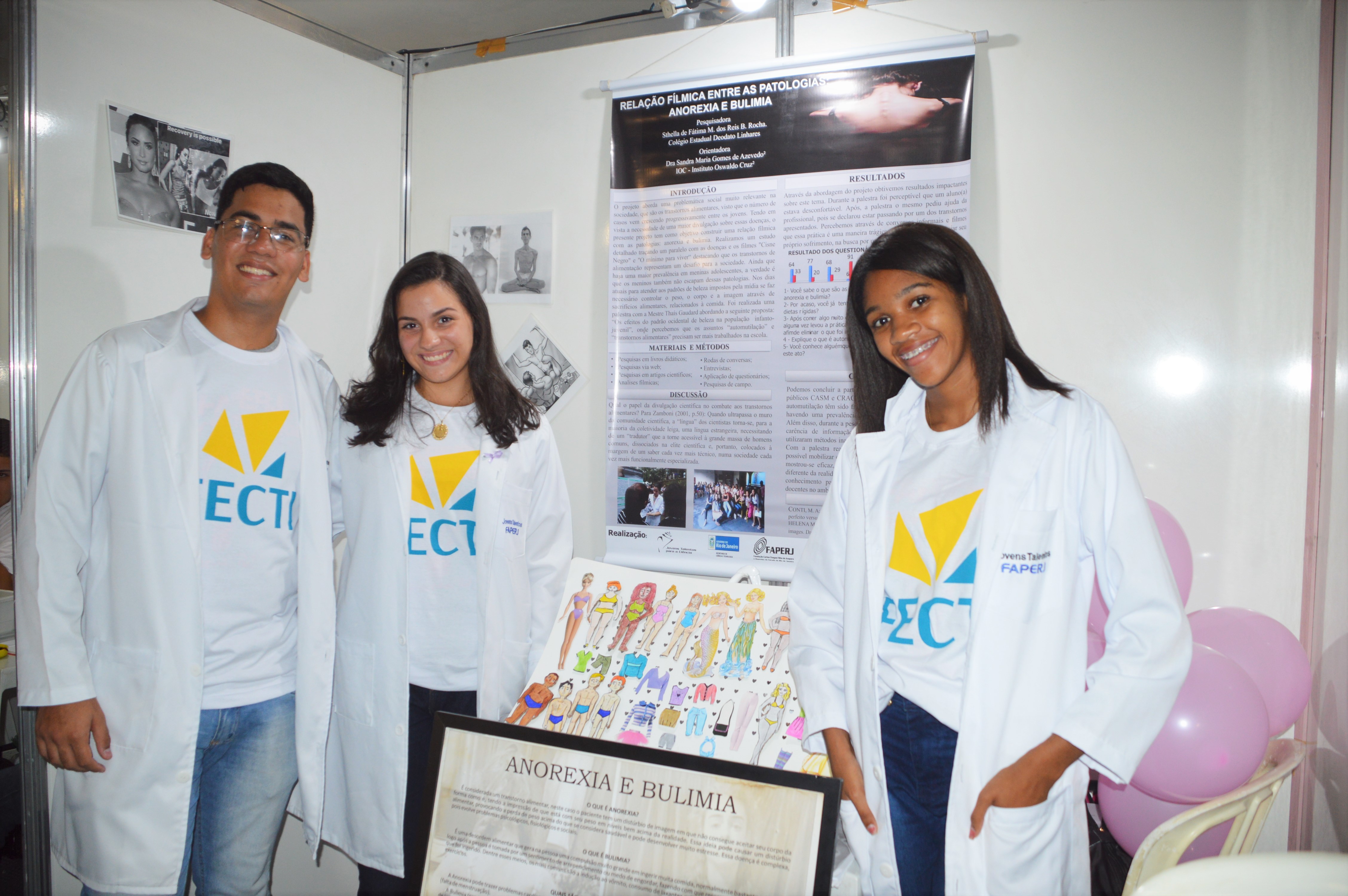 Os alunos Pethersen Bueno, Stela Bueno e Ana Paula Oliveira, do Colégio Estadual Deodato Linhares, localizado no município de Miracema, região noroeste do estado, participaram pela segunda vez da feira e apresentaram um projeto de conscientização e sensibilização sobre transtornos alimentares. Pethersen falou sobre a satisfação de poder participar de uma feira do porte da FECTI. “É importante mostrar que há uma produção científica nas escolas do interior, porque há uma visão de que a ciência está morrendo. Sair do interior, onde não tem toda essa estrutura, para apresentar uma pesquisa junto com outros jovens e pode representar o meu município é gratificante demais.”