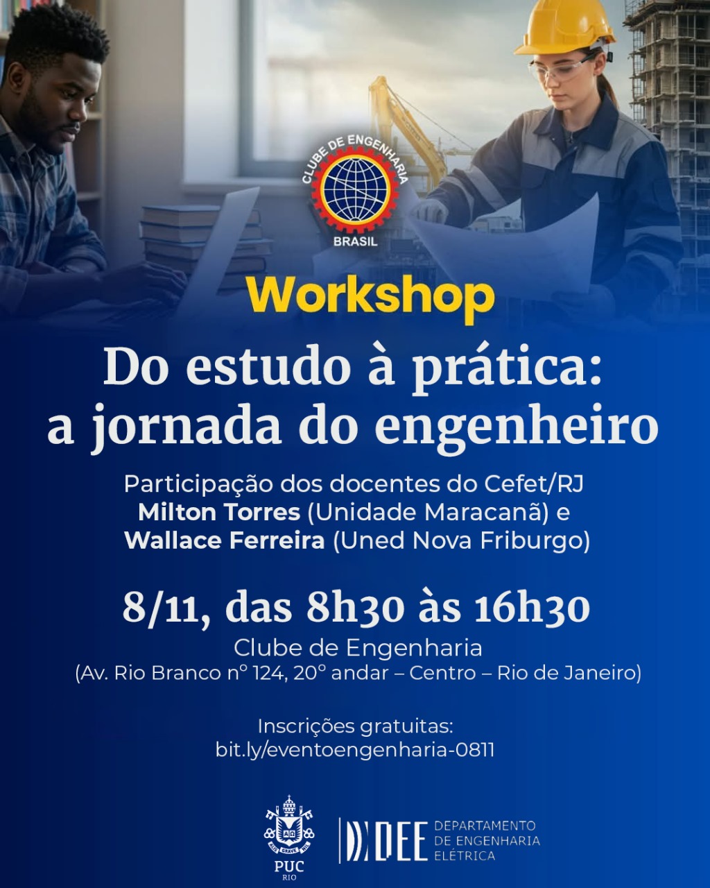 O evento será realizado das 8h30 às 16h30, em formato híbrido, com inscrições gratuitas pelo Sympla. A iniciativa é promovida pelo Departamento de Engenharia Elétrica da Pontifícia Universidade Católica do Rio de Janeiro (PUC-Rio), em parceria com o Clube de Engenharia, e acontecerá no 20º andar da sede do clube, na Av. Rio Branco, nº 124, no Centro do Rio de Janeiro.
